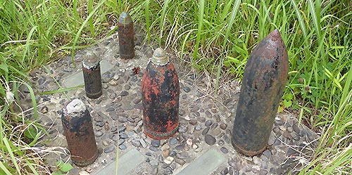 左から、15センチ榴弾砲砲弾、同、10センチ加農砲砲弾、野山砲砲弾(7.5センチ)