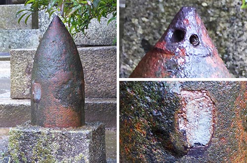 . 金毘羅宮 山口/下関 . 金毘羅宮 御祭神は 境内に砲弾が置かれている。 ▲砲弾 径:約160ミリ、長:約335ミリ 詳細不明 前装砲の翼式弾。弾頭信管。 令和7.10.7