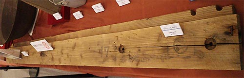 ▲水上機の引揚げレールの枕木、もしくは滑走台に使われたらしい木材。茅ヶ崎製作所の印がある。