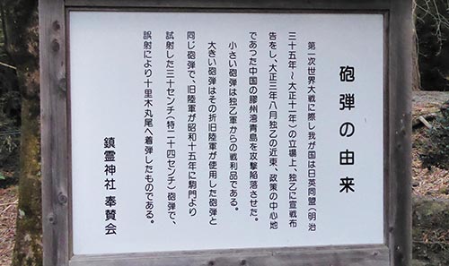 上記の説明板によれば 「青島攻略の折に日本陸軍が使ったのと同じ砲弾で、昭和15年、駒門から試射した三十センチ(特二十四糎砲)砲弾が誤射により十里木丸尾へ着弾したもの」とある。