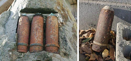 戦捷記念碑に4個はめ込まれていたが、碑の上部右側の表面が剥がれ落ち、1個の砲弾が落下したらしい。