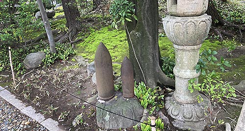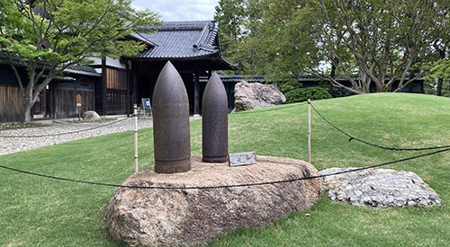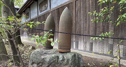 庭園に砲弾が9個置かれている。 軍用米を納めていた関係で、 日露戦の後、軍から記念に贈られたものらしい。