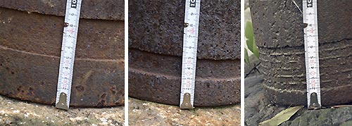 左 径:255ミリ、長:760ミリ 露式二十五糎砲 弾種不詳 陸軍が旅順で鹵獲した海岸砲「四十五口径二十五糎加農」の砲弾の可能性もあり。同砲は露海軍の10吋弾を撃つこともできた。