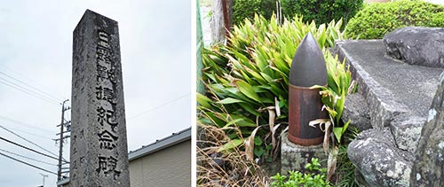 道路沿いの公有地のような一画に日露戦捷紀念碑があり 砲弾が備付けられている。
